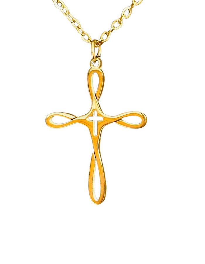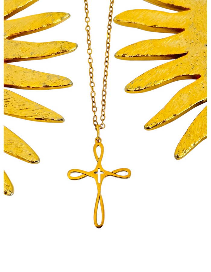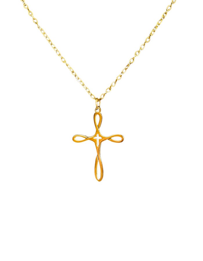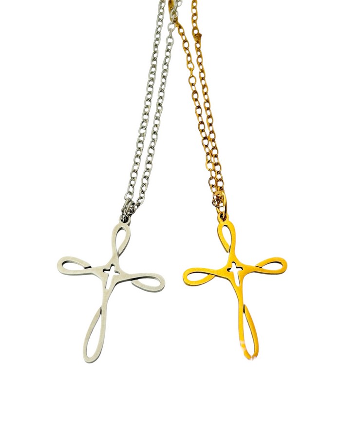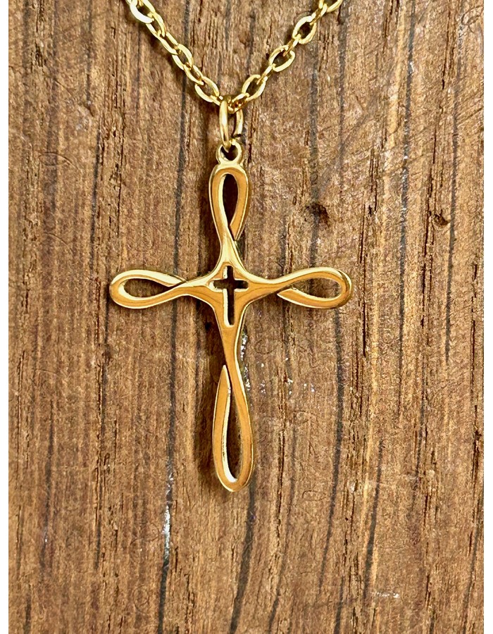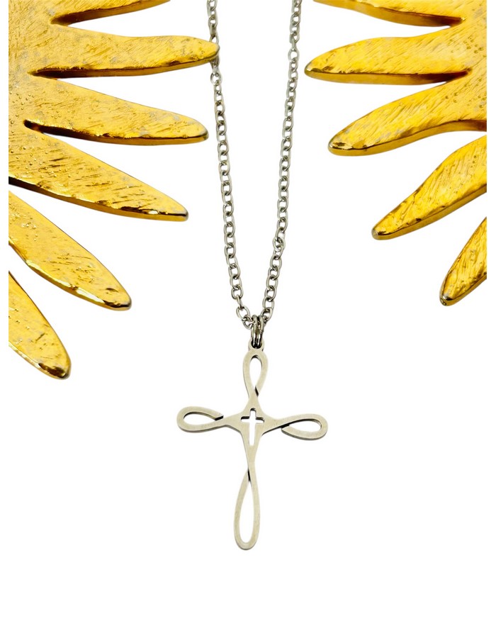 Chaine en acier inoxydable doré de 41 cm ou argenté de 43 cm (avec possibilité de la rétrécir sur simple demande) avec une rallonge de 5 cm et une croix également en acier inoxydable de 2,5 cm de longueur (anneau compris) et 1,7 cm de large.