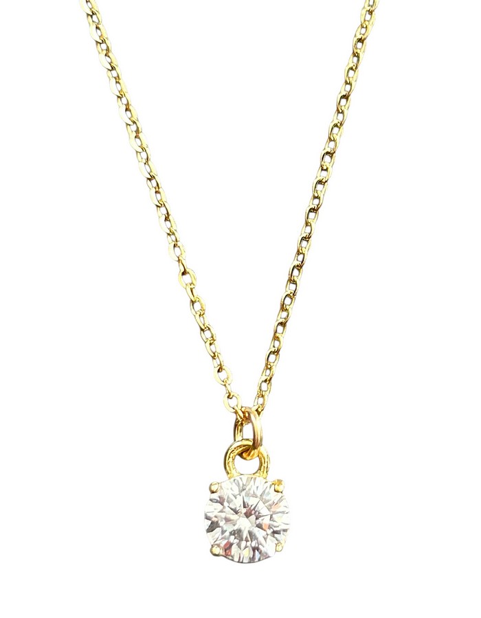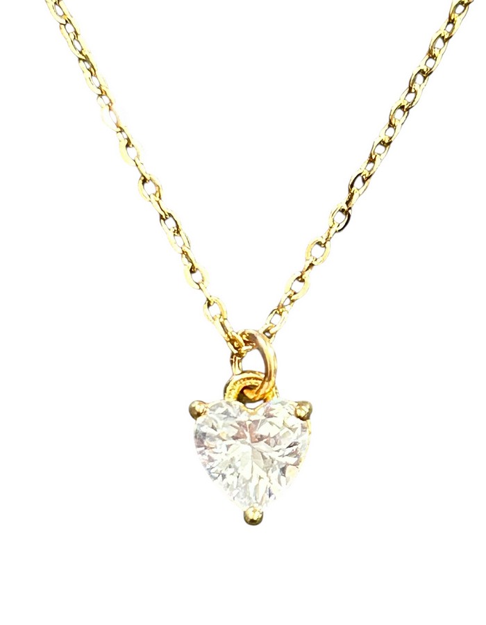 Chaine de 38 cm avec une rallonge de 5 cm et un pendentif avec un strass blanc rond ou en forme de cœur de 1 cm de longueur (anneau compris) et 0,5cm de large.