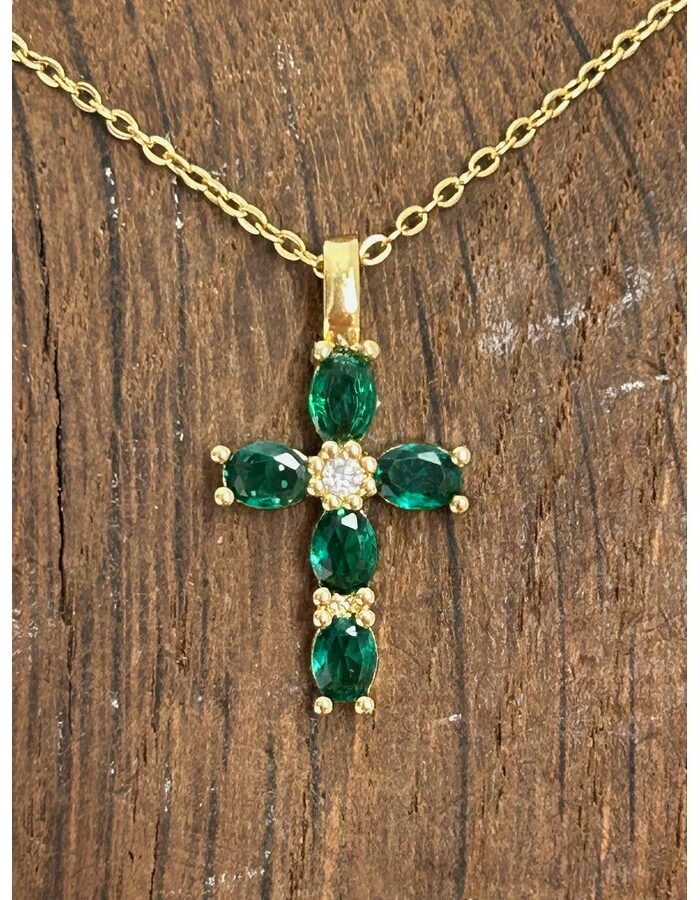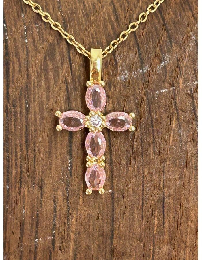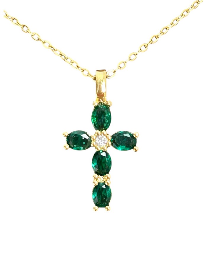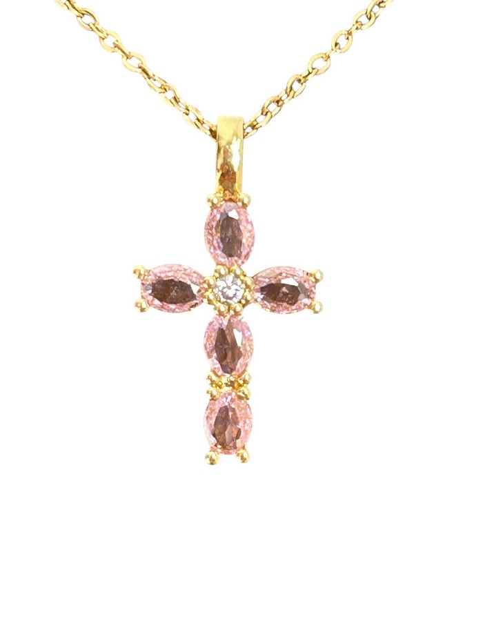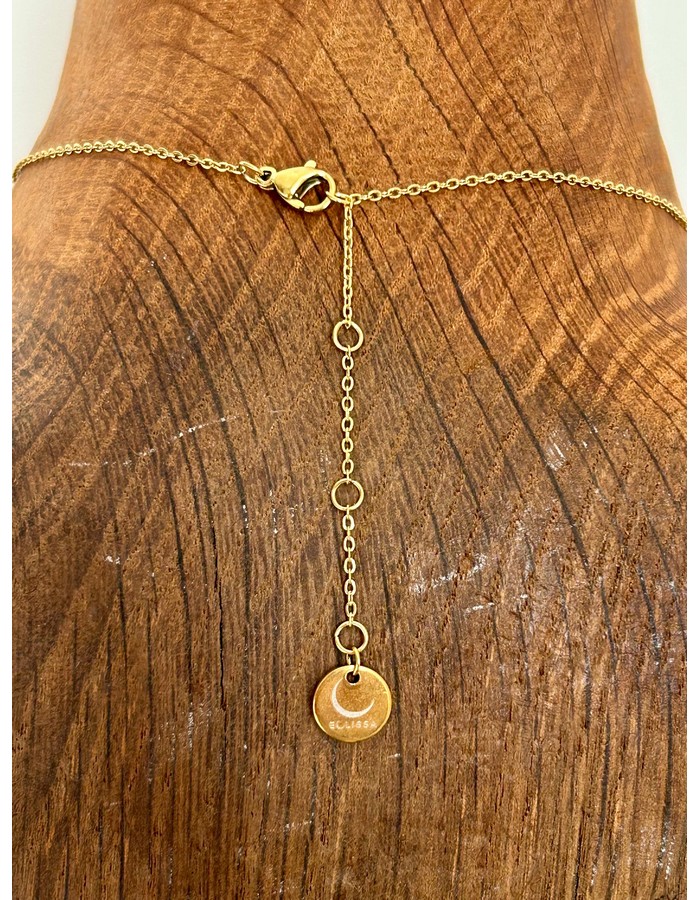 Chaine en acier inoxydable de 38 cm avec une rallonge de 5 cm et un pendentif en plaqué or avec strass de 2 cm de longueur (bélière comprise) et 1 cm de large.
